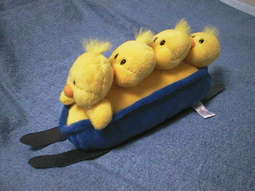 次のウインタースポーツはこれだ!というわけでボブスレーっす。クリスマスリースバージョンと同様のチビひよこを用いたぬいぐるみですが、これがミョーにかわいいんですよ(笑)。しかし、ボブスレーというより、バスタブに入ってるようにしか見えないところがさらにラブリーなのかも。うーん、クールランニングっすねぇ。
